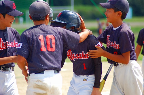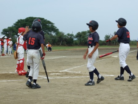 「タイブレーカーの貴重な先取点・・エース自ら、気迫の走塁!!」を祝福するシモン